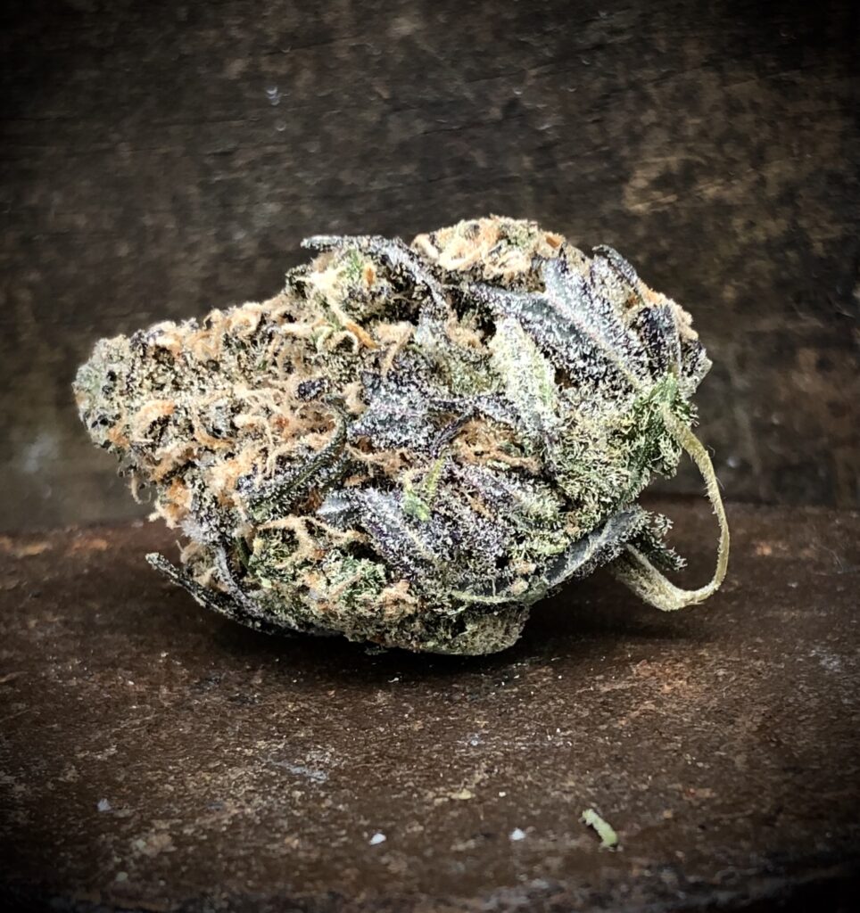 detailed image of bud of bluniverse by grow westThe untrimmed version of Grow West’s Bluniverse is notably frosty looking and the light purplish- blue leaves sporadically twisting through the yellowish white trichomes creates a very nice contrasting visual to the greener parts of the buds.